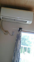 部屋の外から配管パイプのテープに切れ目をいれて、配管、ドレンホース、電線をカットします。