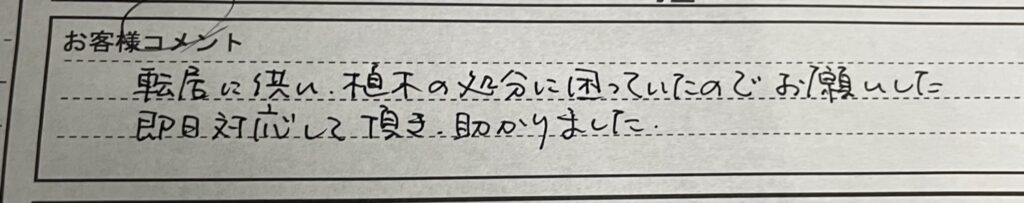 【転居に伴い、植木の処分に困っていたのでお願いした即日に対応して頂き助かりました。】